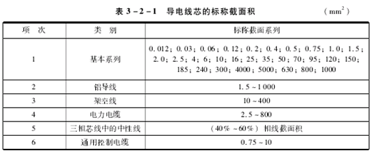 ①导电线芯。导电线芯的材料一般使用铝、铜、钢等优良导电体。导电线芯的标称截面积系列见表 3-2-1。
