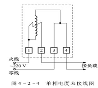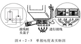 选好单相电度表后,应进行检查安装和接线。根据电度表型号不同,有两种接线方式。一种是交叉接线图如图4-2-3所示,图中的1、3为进线,2、4接负载,接线柱 1要接相线(即火线),这种电度表目前在我国最常见而且应用最多,为了直观,初学者可参照图4-2-5所示的实物图连接;另一种接线是顺入式,1、2为进线,3、4接负载,这种电度表不常使用。