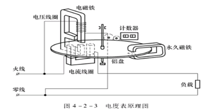 电度表的原理如图4-2-3所示,它由电流线圈、电压线圈、铁芯、铝盘、转轴、轴承和数字盘等组成。