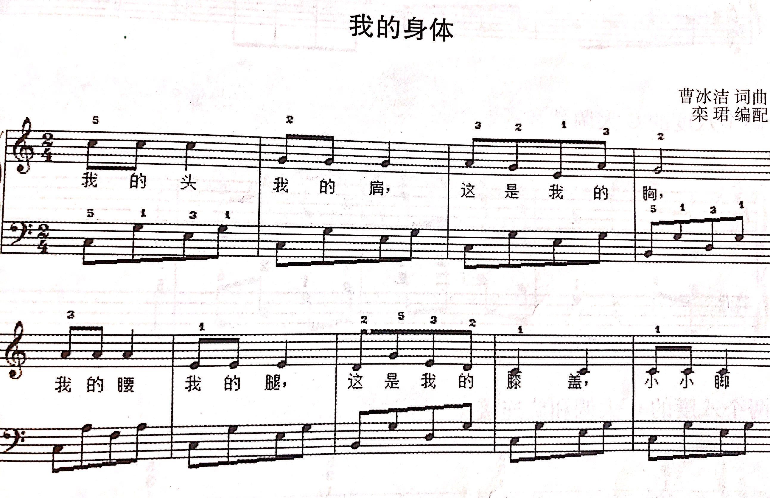 是一首2/4拍欢快、活泼的儿童歌曲,让小朋友认识自己的身体。这首歌曲共四个乐句,旋律优美,注意乐句间在弹奏中的抬手呼吸。