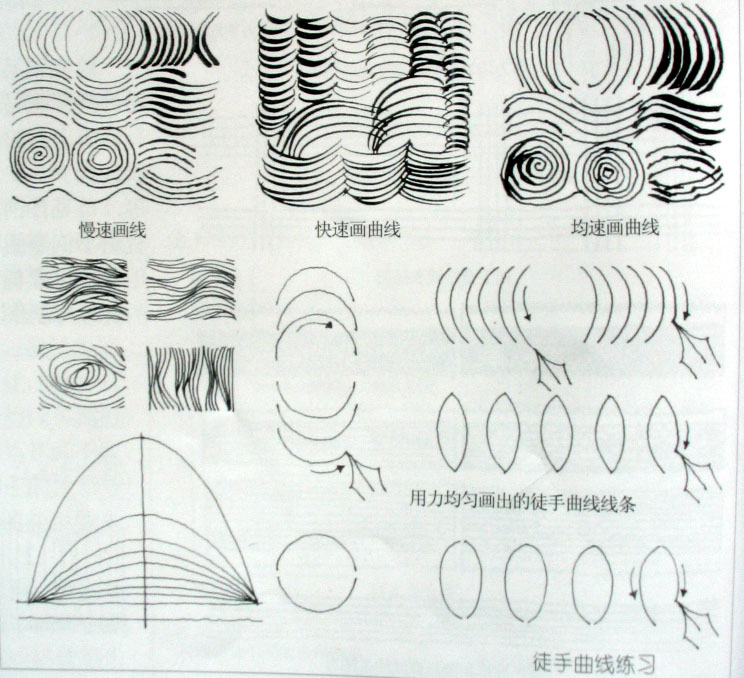 各种直线、弧线、圆形练习;材质纹理等表达练习