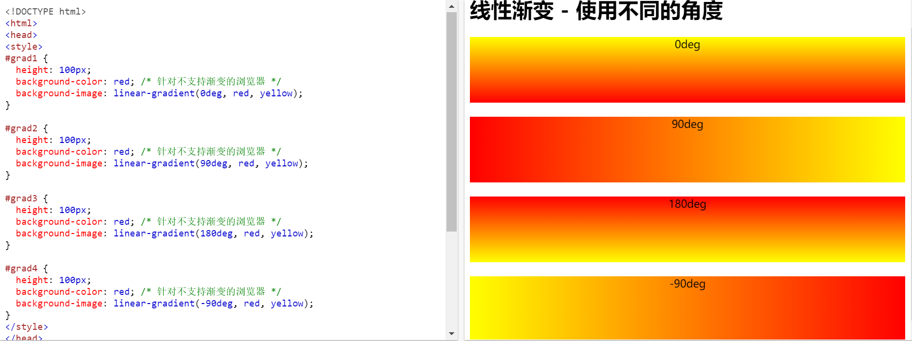 值 0deg 等于向上(to top)。值 90deg 等于向右(to right)。值 180deg 等于向下(to bottom)。