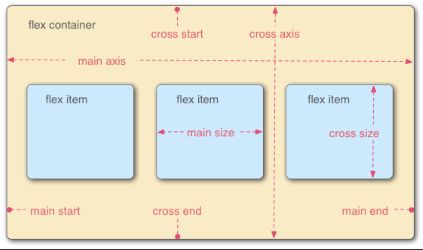 项目默认沿主轴排列。单个项目占据的主轴空间叫做main size,占据的交叉轴空间叫做cross size。