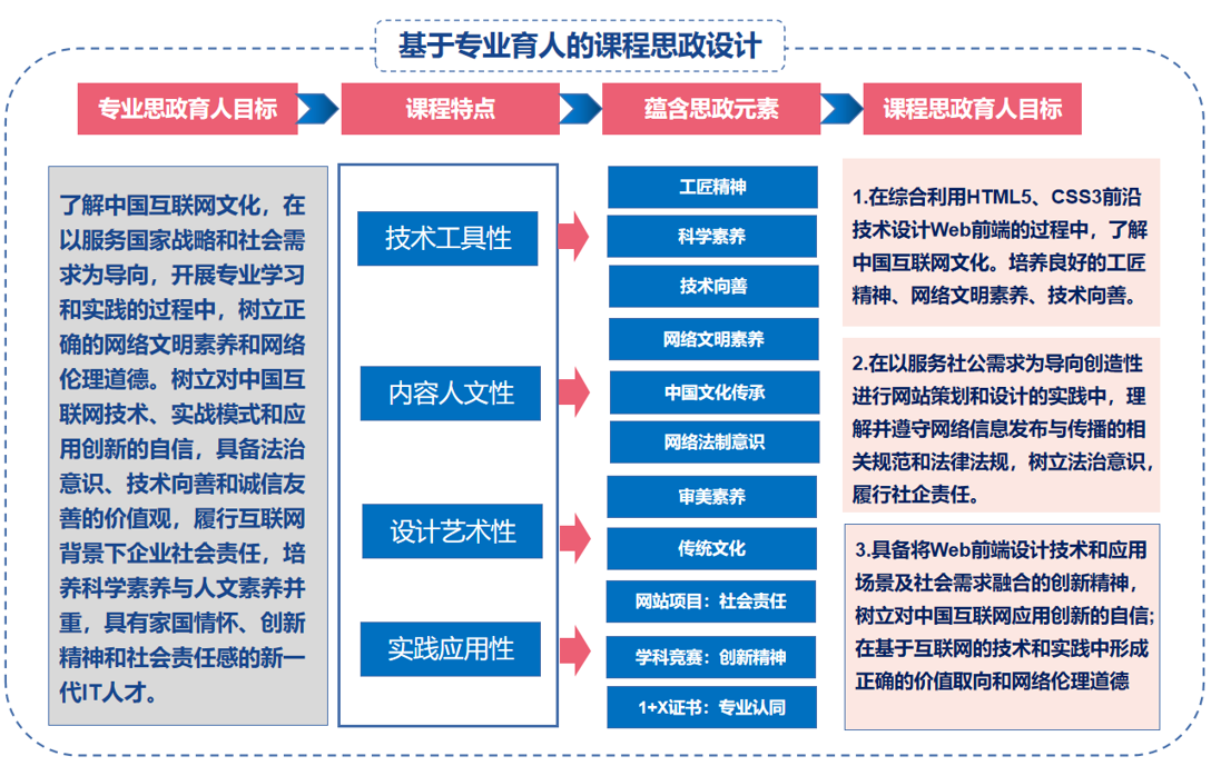 ( 3)结合课程特点挖掘,基于 Web 前端设计 技术与艺术融合的特点,通过对 HTML5 代码编 写规范的训练,培养学生精益求精、严谨认真的 工匠精神;通过优秀企业网站设计案例,提高学 生的审美素养。