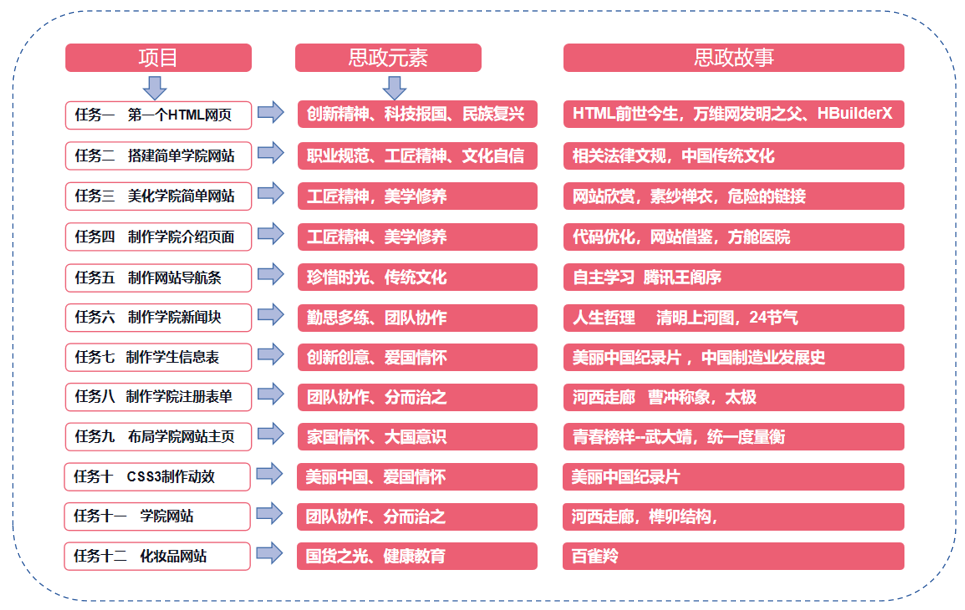 ( 4)结合网站项目挖掘,挖掘网站内容中蕴 含的思政元素,结合国家战略和北京特色,引导 学生将“三农电商”“乡村振兴”“非物质文化遗 产”“北京文化”等作为网站选题,学生在小组 项目实践过程中,感受传统文化,激发社会责任 感和家国情怀。