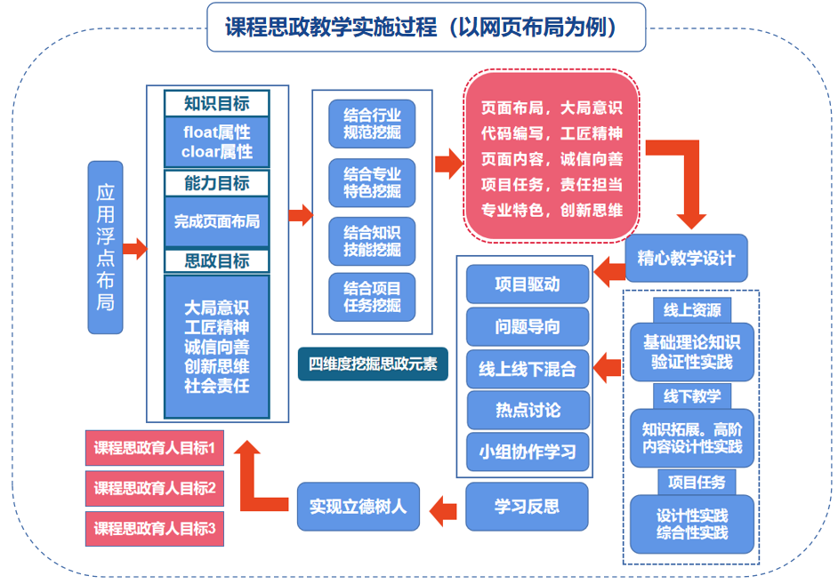 基于课程知识、能力和思政目标,从行业热 点、专业特色、课程知识点、网站项目 4 个维度 挖掘思政元素,精心进行教学设计,通过项目驱 动、问题导入、线上线下混合、热点问题导论、 小组协作学习等多元化方法将思政元素融入到知 识传授和能力培养过程中,从而达成课程的教学 目标。