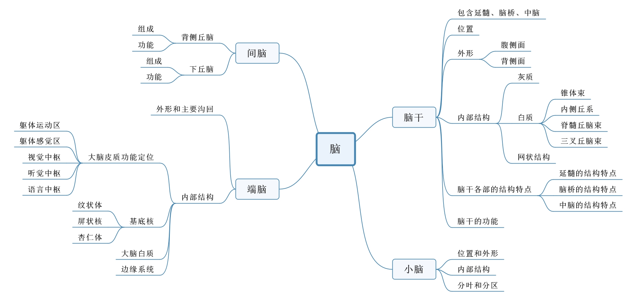 脑干的结构:脑干连接大脑、小脑和脊髓,包括延髓、脑桥和中脑等部分。