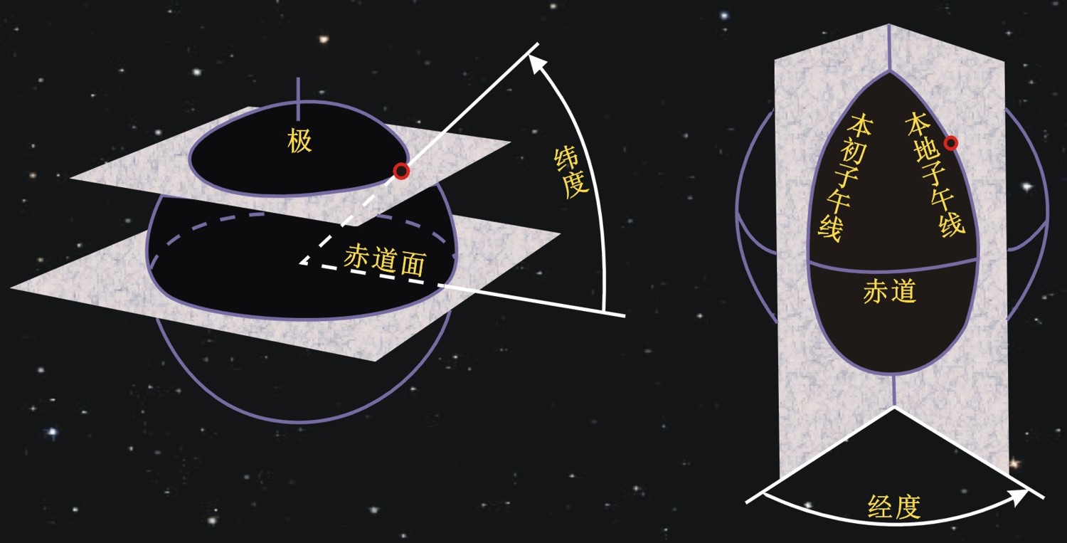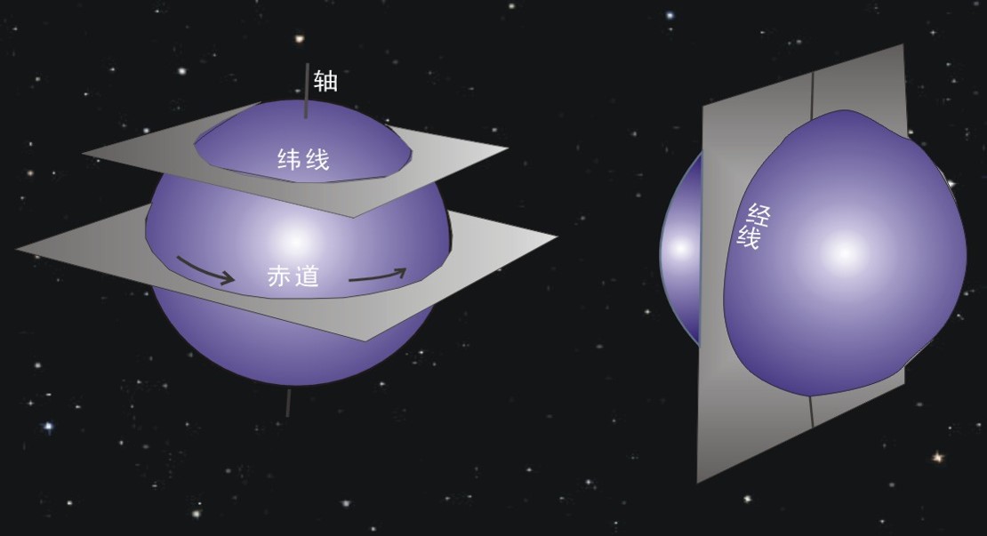几个基本概念:地心;地轴;地极(南极、北极);经线圈(经圈);经线(子午线);本初子午线;本初子午面;本地子午线;本地子午面;纬线圈(纬线);赤道;赤道面。