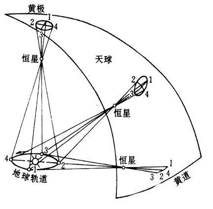 黄纬愈高,年视差和光行差椭圆的偏心率都愈小;恒星年视差沿轨道半径方向偏离其平均位置;恒星光行差则沿轨道切线方向偏离其真位置。