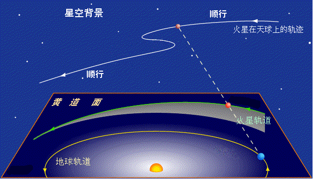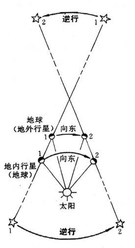 通常行星在恒星间自西向东运行,叫顺行。当行星在其轨道上接近地球时,即下合前后的地内行星和冲日前后的地外行星,在天球上转变为向西运行,叫逆行;经短暂时间后又恢复顺行。