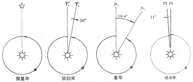 恒星年:以无明显自行的恒星为参考点,长度365.2564日。回归年:以春分点为参考点,春分点每年西移50.2",短于恒星年,长度为365.2422日。近点年:以近日点为参考点,近日点每年东移11" ,长于恒星年,为365.2596日。交点年(食年):以黄白交点之一为参考点,黄白交点每年西移19.4°,短于恒星年,长度为346.6200日。