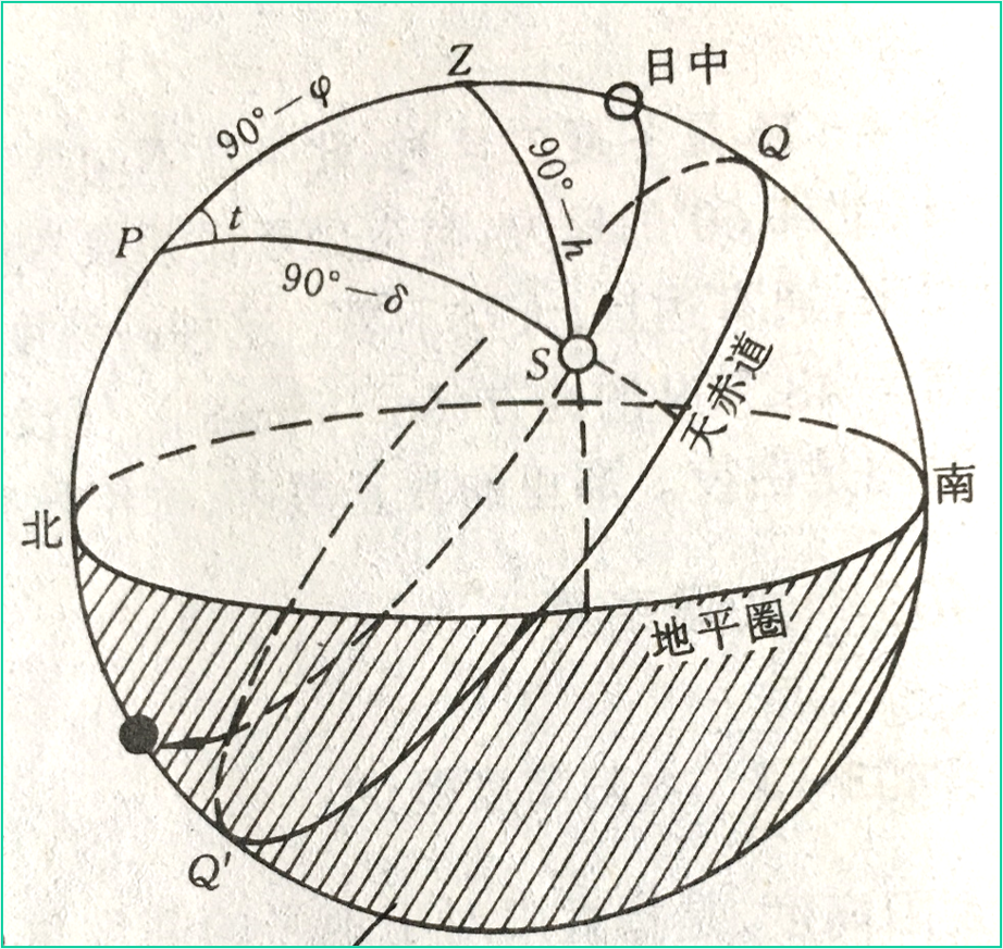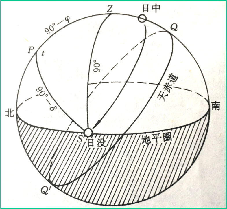 式中,δ以夏半年为正,冬半年为负;φ在南北半球都为正。式中的(90°-φ)可看作上点高度。