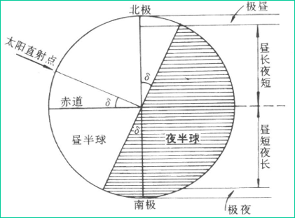 δ为正值,全球昼长向北递增;δ为负值,向南递增。