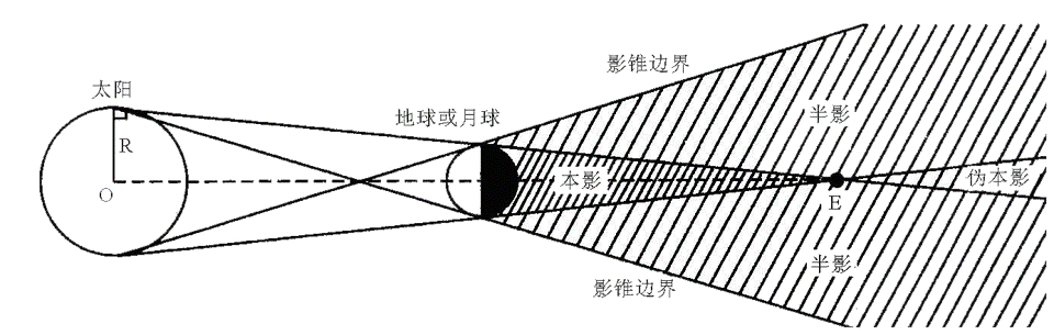 本影:是一个以其顶端背向太阳的圆锥,太阳光辉全被遮蔽。半影:在影区内,得到部分的太阳光辉。伪本影:是一个与本影同轴而反向的圆锥,得到太阳边缘光辉。
