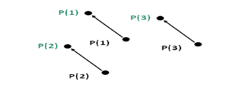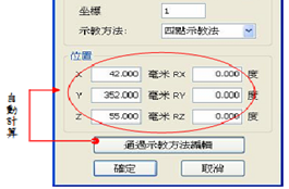 在某些应用场合下,有些关联点必须同时集体平移一个固定距离,但并不需要在姿态上作改变。此法可定义一个坐标系,将欲集体平移的所有点位关联在一起。而其坐标原点就是其中的一个点P(N) 。当P(N) 产生平移时,可用此法再次定义坐标系原点欲平移后的点位P(N),无需针对所有点重新示教,就可以达成点位集体平移。
