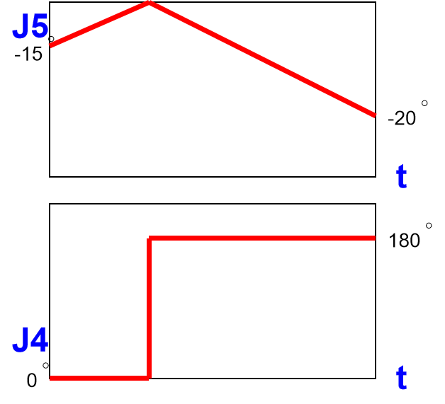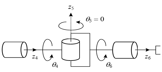 六轴机器人在运动过程中若五轴角度为0度(J5=0),第四轴与第六轴共线(J4//J6),在作逆向运动学计算时,第四轴和第六轴两轴的角度会产生无限多组解。这种位置在机器人学上称之为奇异点(见图4-4-1)。