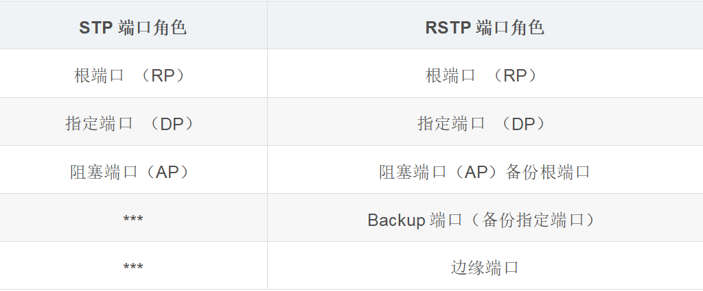 RSTP根据端口在活动拓扑中的作用,定义了3种端口角色(STP有5种角色):禁用端口(Disabled Port)、根端口(Root Port)、指定端口(Designated Port)、为支持RSTP的快速特性规定的替代端口(Alternate Port)和备份端口(Backup Port)。