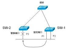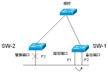 如图4所示,SW-1的P1和P2口同时接入到以太网的同一网段,P1为指定端口,P2 优先级低,则P2端口为备份端口。