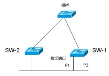 与STP一样,每个以太网网段段内必须有一个指定端口。假设SW-1的BID比SW-2 优先,而且SW-1的P1口端口ID比P2优先级高,那么P1为指定端口,如图2所示。