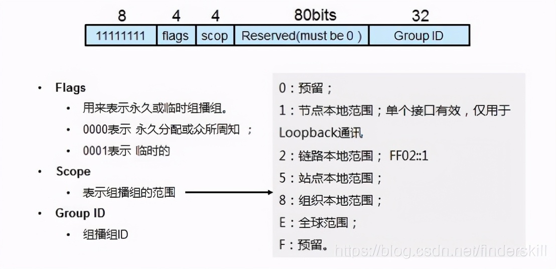 组播地址:用来标识一组接口(通常这组接口属于不同的节点),类似于IPv4中的组播地址。发送到组播地址的数据报文被传送给此地址所标识的所有接口。