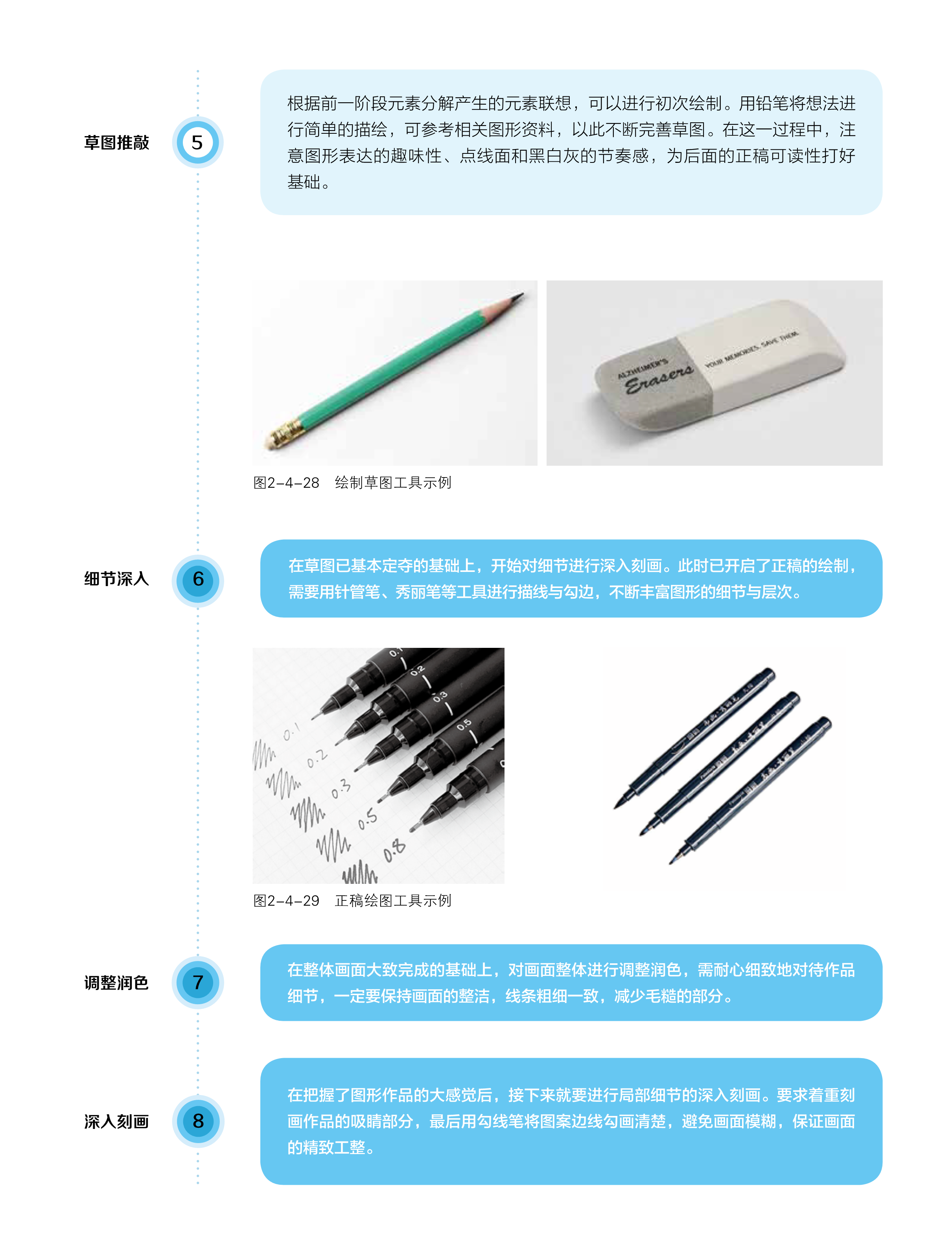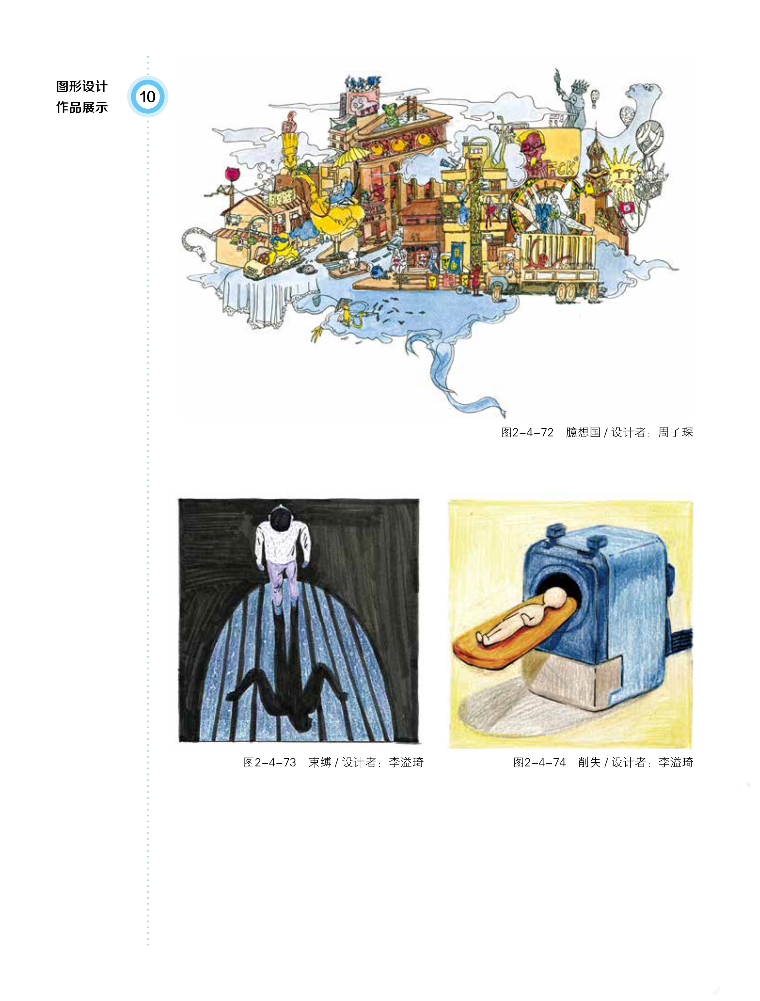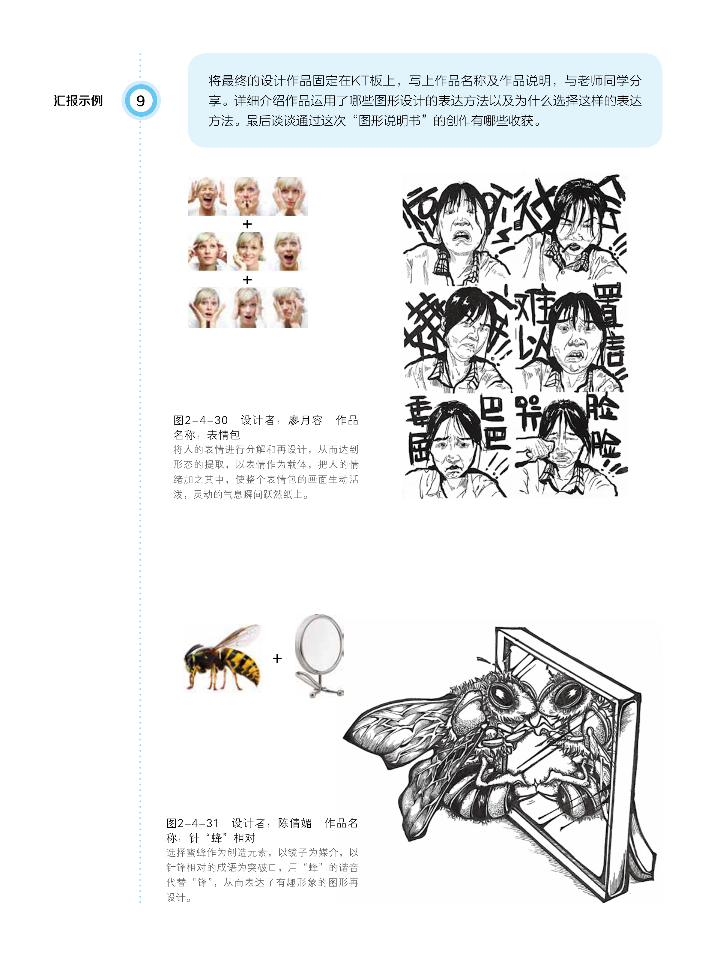 在做图形的传达性设计训练的时候,学生需要了解设计对象最基本的性质和特点,在进行图形表达的时候要以规范流程来表现设计的秩序性。通过观察和理解,利用视觉的表现,促进创新性思维的形成。从认知、了解、熟识,再到创作和重复修改的过程,这种设计过程一般需要经过项目解读—文化调研—确定对象—确定表现步骤—相关联想—传达性推敲—草图推敲—调整润色—汇报展示等多个步骤。