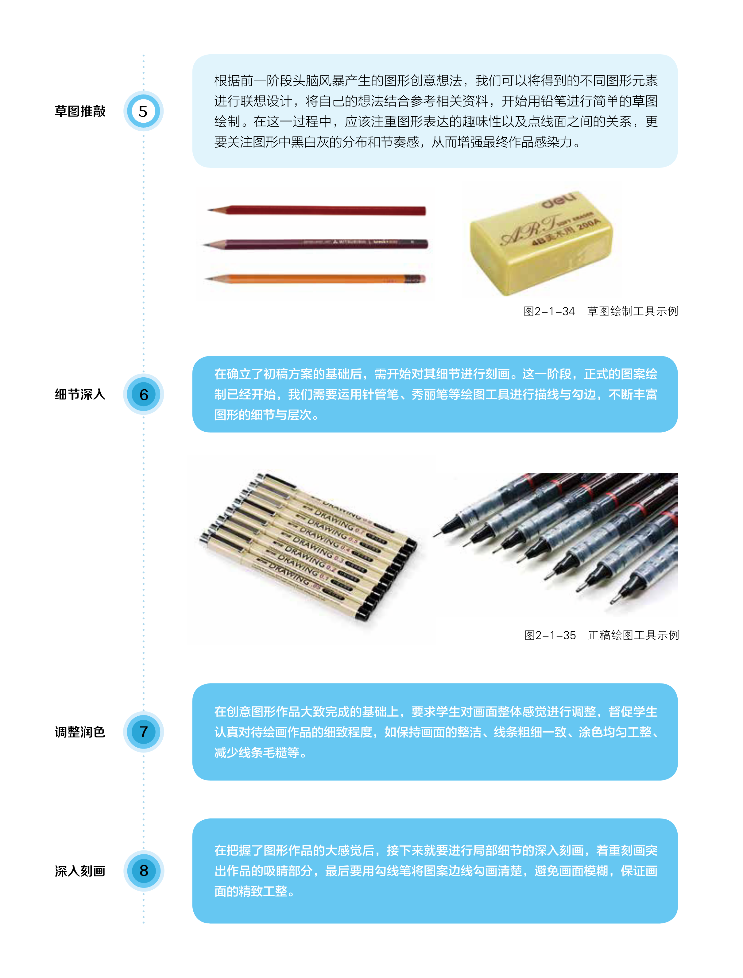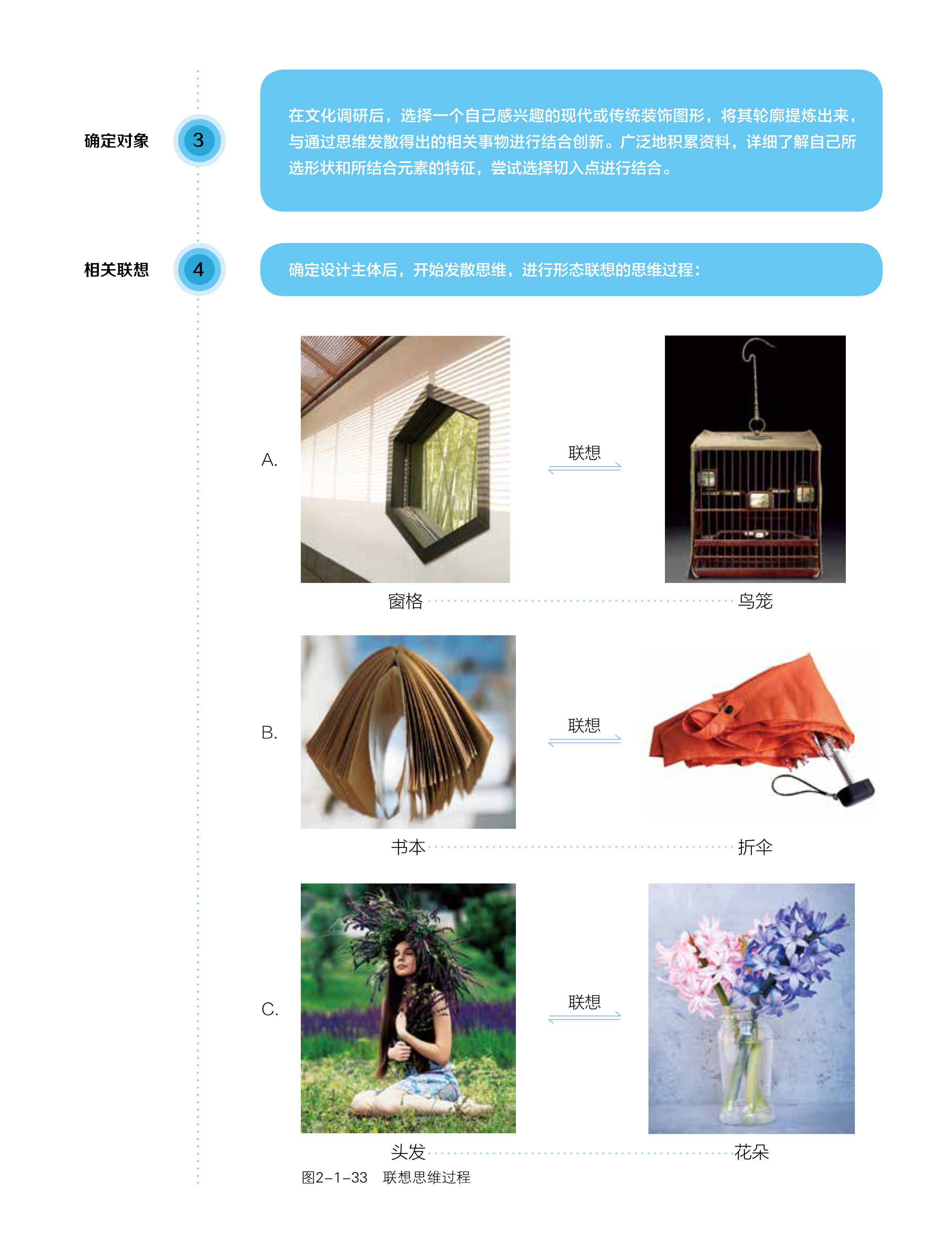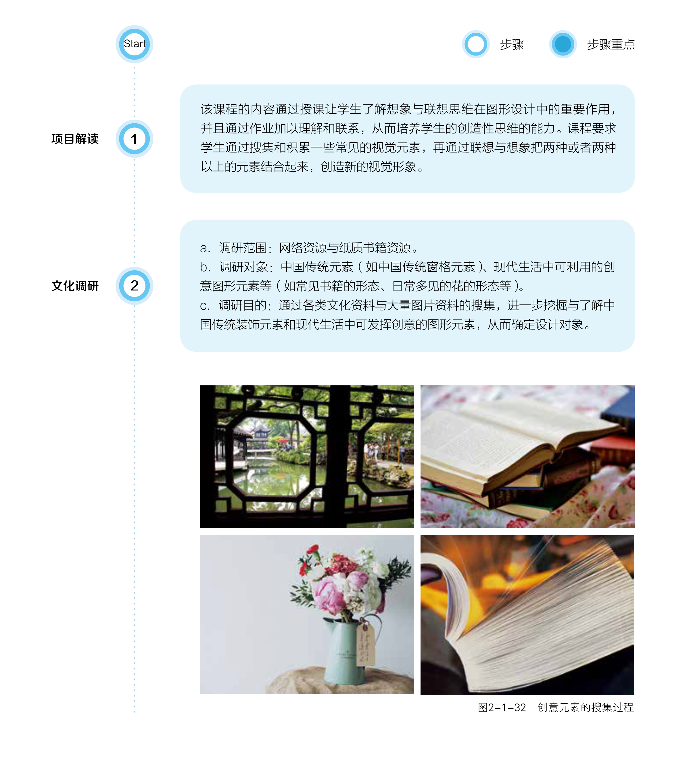 在做图形设计训练的时候,学生需要了解设计对象最基本的性质和特点,在进行联想与表达的时候要一个规范流程来表现设计的秩序性。通过自己的观察和理解,利用视觉传达的能力,促进创新性思维的形成。从认知、了解、熟识,再到创作和重复修改的过程,这种设计过程一般需要经过项目解读—文化调研—确定对象—相关联想—草图推敲—调整润色—汇报展示等多个环节。具体步骤如下。
