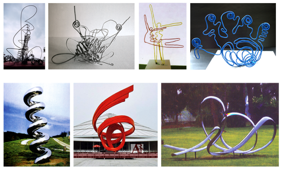 线材的连续构成分为限定构成和自由构成两种形式。限定构成是由控制点运动的范围来确定其形态;自由构成是不限定范围,以连续的线做自由构成,使其产生连续的空间效果。表现对象可以是具象的,也可以是抽象的。