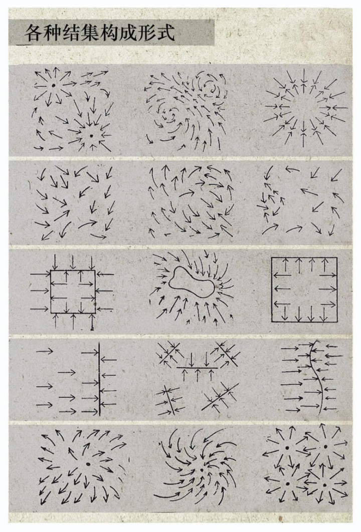 预置形密集:是依靠在画面上预先安置的骨格线或中心点组织基本形的密集与扩散,即以数量相当多的基本形在某些地方密集起来,而从密集又逐渐散开来。