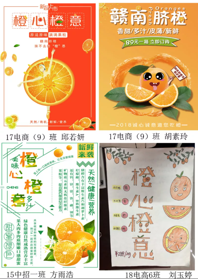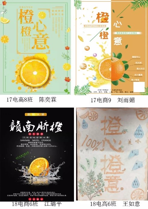 在谢同学毕业后,这一营销活动一直延续下来,截止去年已经办了四届比赛。在全校范围产生了积极影响。而今他准备把质优价廉的江西本土水果推广到网店中,并联系到我希望能通过学弟学妹帮他完成在水果上市前,设计出若干网店海报,实现更好的营销推广,这也是帮助我们的脐橙营销大赛继续办下去的契机,我提出倡议同学们积极参与进来,大家说好不好!