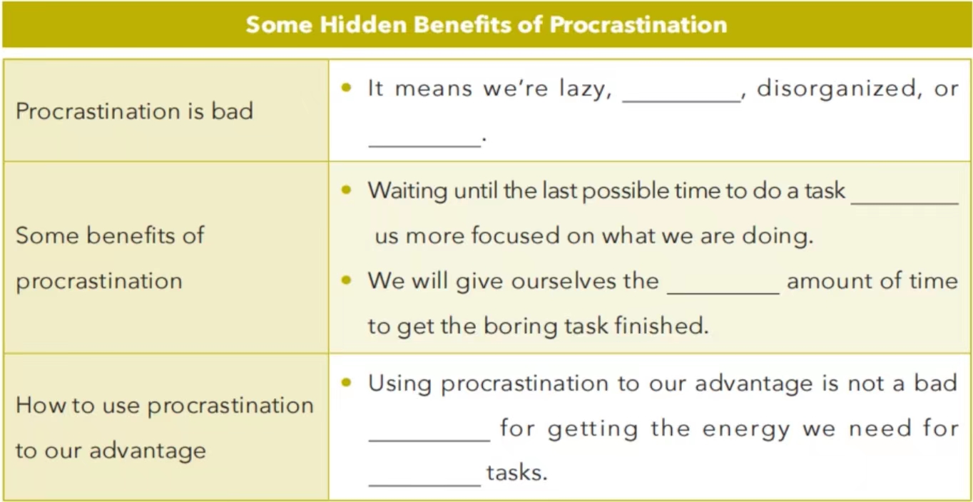 2. Procrastinating can bring us some benefits EXCEPT __.
