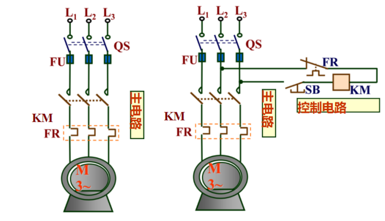控制电路:按钮、接触器线圈、热继电器常闭触点。接在两相之间,控制电路中的电流较小。
