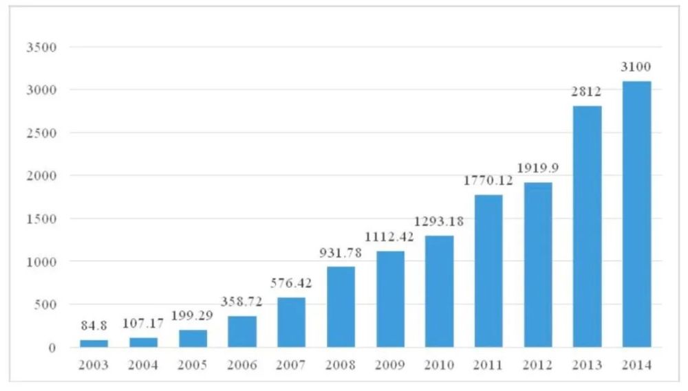 图1:中国石油钻采设备销售收入(亿元),2003-2014。数据来源:《中国石油石化设备工业年鉴2015》第28页