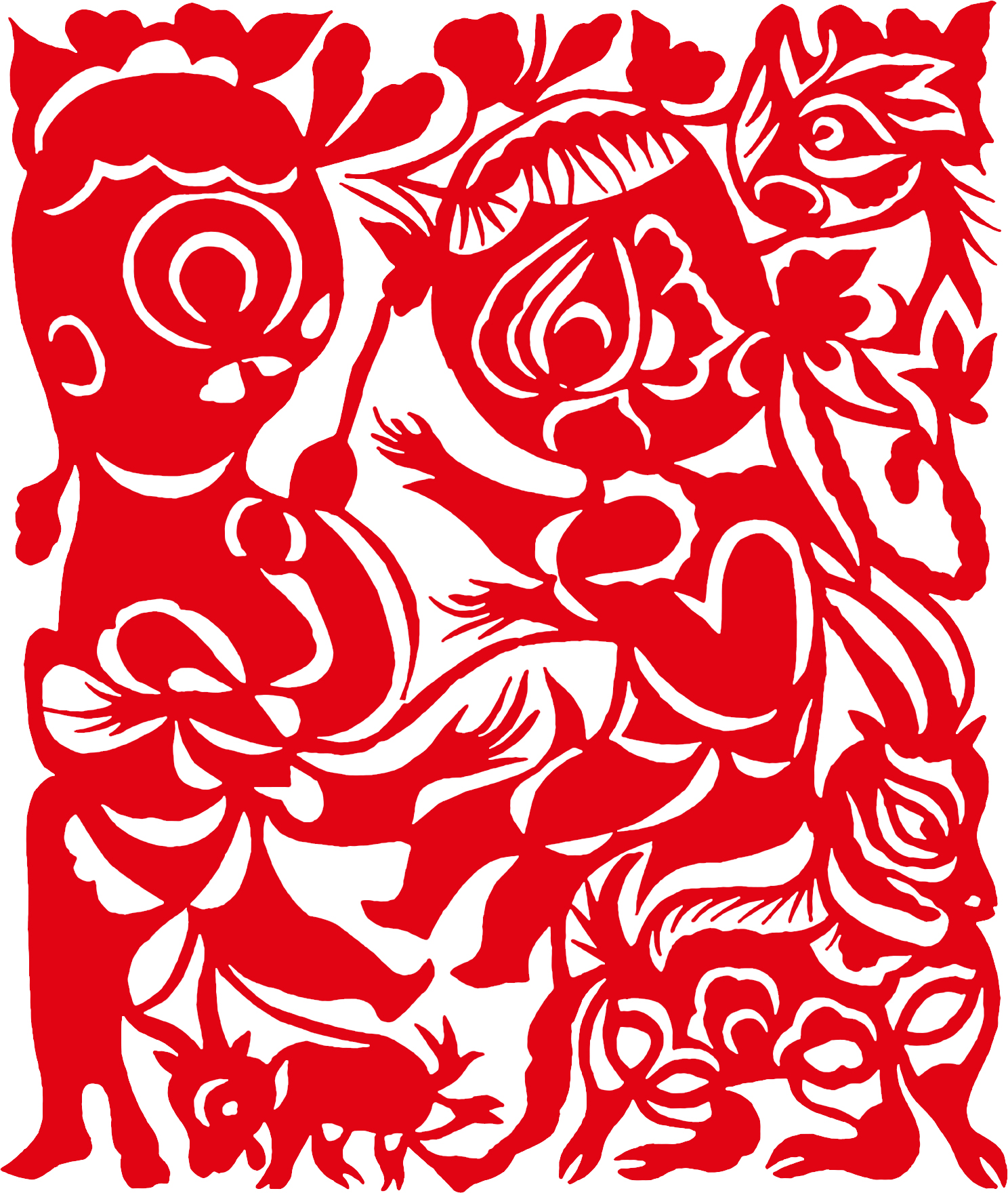剪刻纸中的形象,为意象,非实象。意象并不是写实的,也并非现实的、自然中的真实形象。它是可以表达一定思想情感的心理形象。剪刻纸艺术中的意象造型是主观的造型手法,以意构象,以象寓意,具有极大的自主性和自由性,是以传达创作者的精神和思想为终极目标的一种表现方式。另外,在画面结构的表现上,创作者根据主观心理和符瑞观念,运用时空错位等奇异的构成方式,以主观意象将不同的物象在二维“心象”平面自由排布,生成独特的视象意态。
