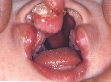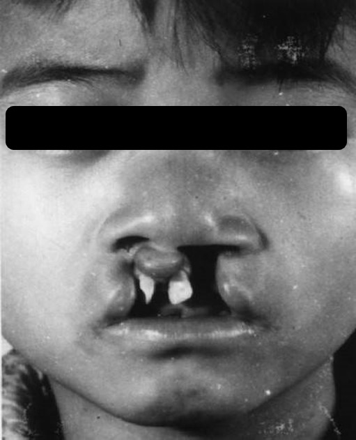 ★一侧侧腭突和对侧侧腭突及鼻中隔未融合或部分融合。80%伴唇裂,也常伴颌裂(图1.3-5)。轻者仅为悬雍垂裂,严重者从切牙孔至悬雍垂全部裂开。