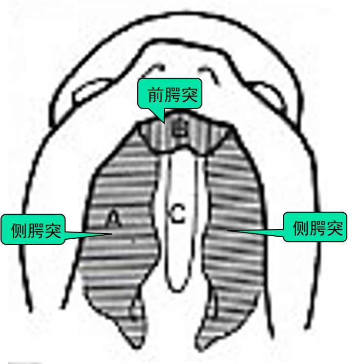来自中鼻突,它的发生与鼻板、鼻凹及侧鼻突、上颌突的发育有密切关系。在胚胎第6周,球状突在与对侧球状突及上颌突向中线推移,相互联合的过程中,不断向口腔侧增生,形成前腭突。前腭突将形成前腭骨和上颌切牙。