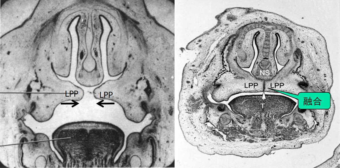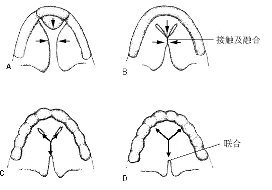 ①方向:最初,侧腭突向中线方向生长,由于舌充满了口鼻腔,所以侧腭突向下或垂直方向生长,位于舌的两侧(图1.3-2),胚胎第8周,舌逐渐变扁平,位置下降,侧腭突向水平方向转动并向中线生长(图1.3-3)。
