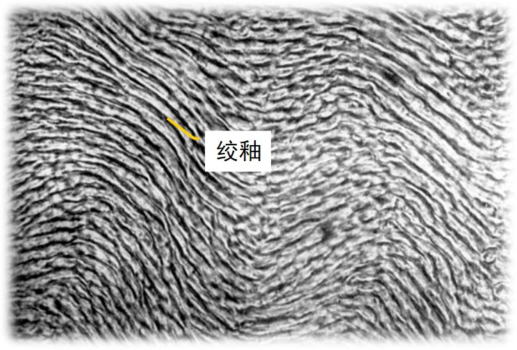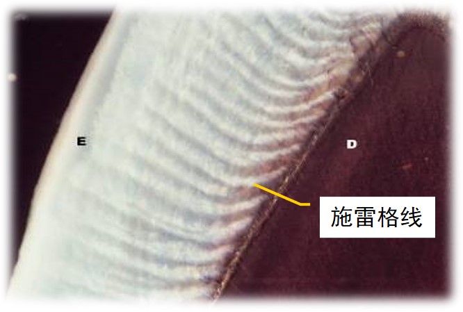 ②施雷格线(Schreger line):用落射光(光线照到样品上反射回来,光源在样品上方,光往下走。新型的落射光装置是从光源射到干涉分光滤镜后,波长短的部分,紫外和蓝紫,由于滤镜上镀膜的性质而反射。当滤镜对向光源呈45度倾斜时,波长短的部分则垂直射向物镜,经物镜射向标本,使标本受到激发,这时,物镜直接起聚光器的作用。)观察牙纵向磨片时,可见宽度不一的明暗相间带,分布在釉质厚度的内4/5处,改变入射角度可以使明暗带发生变化,这些明暗带称为施雷格线(图3.1-13)。这是由于规律性的釉柱排列方向改变而产生的折光现象,暗区代表釉柱的横断面,亮区代表釉柱的纵断面。