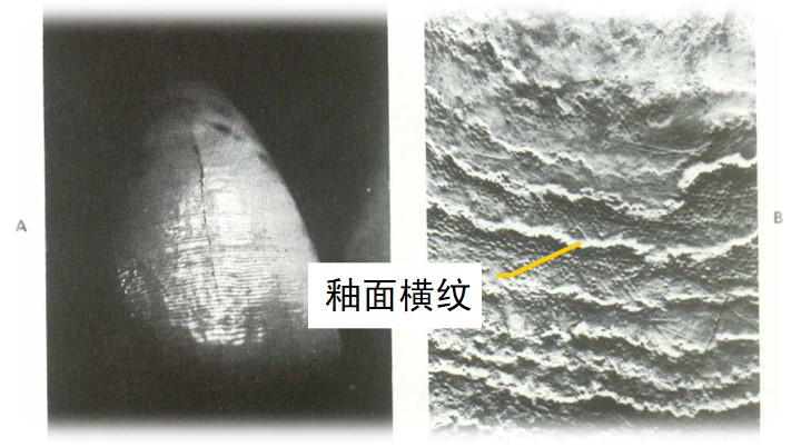 2、釉面横纹(perikymata):是指釉质表面呈平行排列并与牙长轴垂直的浅凹线纹,间隔为30~100um,在牙颈部尤为明显,呈叠瓦状(图3.1-15)。