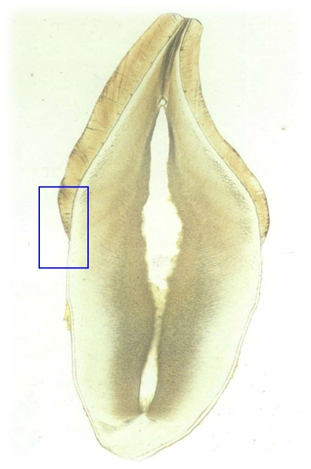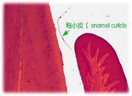 1、釉小皮(enamel cuticle):是指覆盖在新萌出芽表面的一层有机膜,一经咀嚼极易被磨去,但在牙颈处残留(图3.1-14)。其结构与上皮下的基板相似,可能是成釉细胞在形成成釉质后分泌的基板物质。