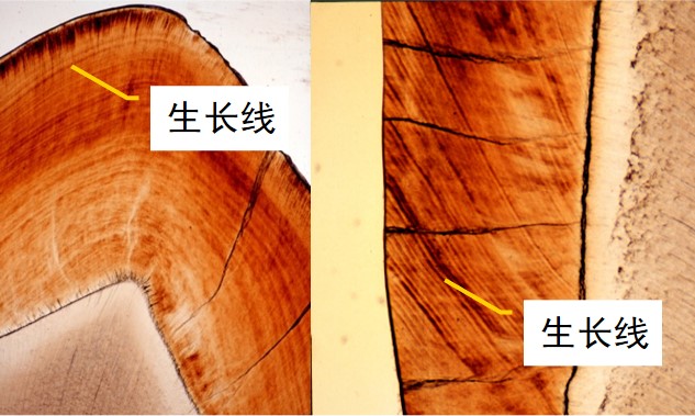 ②生长线(incremental lines )(图3.1-11):釉质生长线又名芮氏线(lines of Retzius),低倍镜下观察釉质横断磨片,此线呈深褐色同心环状分布,类似树的年轮;在纵向磨片中,生长线自釉质牙本质界向外,沿着釉质形成的方向,在牙尖部呈环形排列包绕牙尖,近牙颈处渐呈斜行线。生长线是研究釉质发育状况的一个标志。