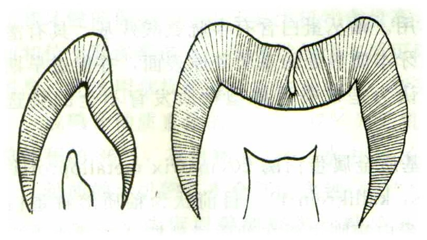 1、厚度:自切缘(切牙的厚约2mm)或牙尖(磨牙的厚约2.5mm)处至牙颈部逐渐变薄,颈部呈刀刃状(图3.1-1)。