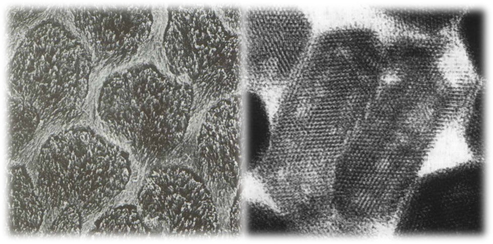 ②晶体:釉柱由有一定排列方向的扁六棱柱形晶体所组成(图3.1-5右)。宽约60~70nm、厚约25~30nm,最长的晶体可以贯穿整个釉质的厚度。釉柱晶体是全身中各种矿化组织晶体中最大的。釉质晶体在釉柱头部互相平行排列,其长轴平行于釉柱的长轴;从颈部向尾部移行时,晶体长轴的取向逐渐与长轴成一角度,至尾部时已与釉柱长轴呈65~70的倾斜。因此,在一个釉柱尾部与相邻釉柱头部的两组晶体相交处呈现参差不齐的增宽的间隙,称为釉柱间隙(图3.1-6);釉柱间隙构成了釉柱头部清晰的弧形边界,即釉柱鞘enamel rod)。
