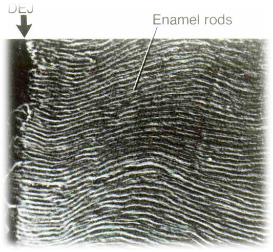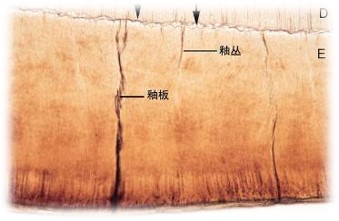 釉柱光镜像:纵断面可见釉柱和柱间质、横剖面呈鱼鳞状(图3.1-4)。
