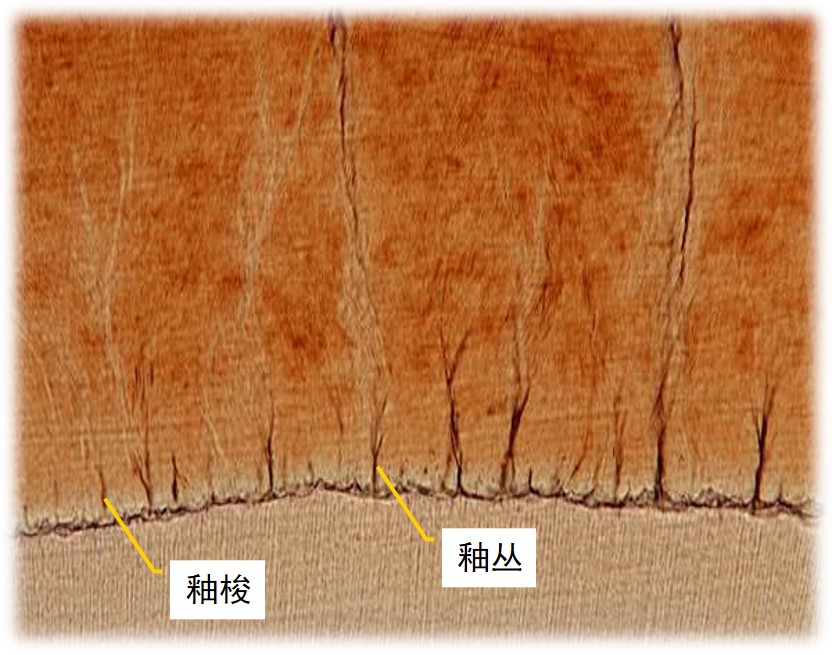 ②釉梭(enamel spindle):是起始于釉质牙本质交界处伸向釉质的纺锤状结构。形成于釉质发生的早期,此时,成牙本质细胞(odontoblast)突起穿过基底膜(位于牙乳头与成釉器之间/外间充质与外胚层之间/结缔组织与上皮组织之间),伸向前成釉细胞之间,釉质形成时此末段膨大的突起即留在釉质内形成釉梭。多见于牙磨片的牙尖及切缘处。在干燥的牙磨片中,釉梭的有机物分解代之以空气,在透射光下,此间隙呈现黑色(图3.1-8)。