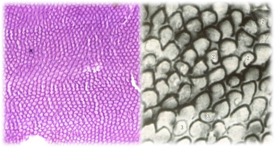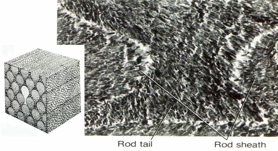 釉柱电镜像:电镜下呈球拍样(图3.1-5左),有一个近乎圆形的较大的头部和一个较细长的尾部。相邻釉柱均以头尾相嵌的形式排列。釉柱的头部相当于纵断面的釉柱,尾部相当于柱间质。不同部位的釉柱横断面可由不同形态表现。