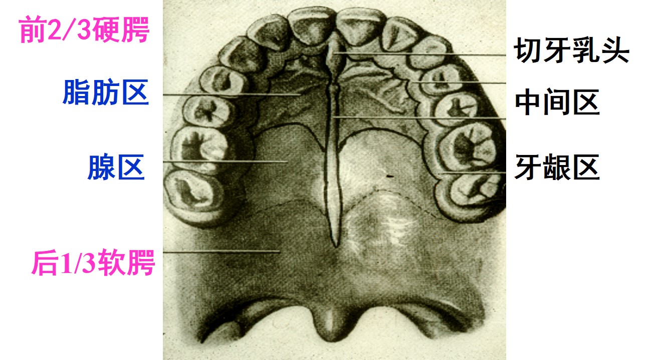 1.(硬)腭黏膜:由两部分组成,前2/3为硬腭,后1/3为软腭。两者相延续,有明显的分界。