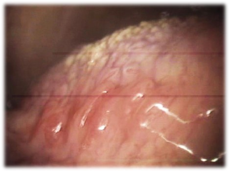4. 叶状乳头(foliate papilla):位于舌侧缘后部,在人类乳头为退化器官,呈5~8条平行排列的皱襞。正常状态下,此乳头不明显,炎症时往往肿大、且伴疼痛(图5.2-8)。