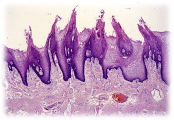 4. 舌腹黏膜:薄而光滑、上皮无角化、结缔组织乳头多而短。黏膜下层不明显,黏膜紧接舌肌束周围的结缔组织。