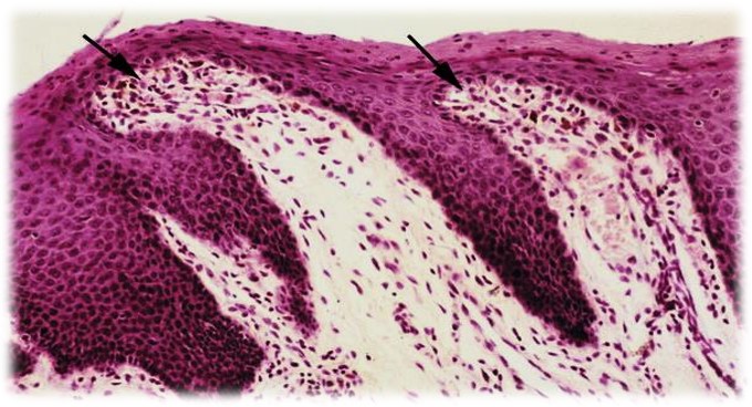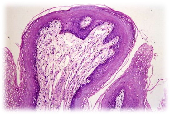 ①上皮有角化(正角化时有明显的颗粒层、不全角化时颗粒层不明显。)