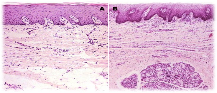 ①硬腭黏膜:呈浅粉红色,表面角质层较厚。根据有无粘膜下层可将其分为四部分(牙龈区、中间区、脂肪区、腺区)(图5.2-1)。牙龈区和中间区没有粘膜下层,固有层与骨膜紧密相连;脂肪区和腺区有粘膜下层,有很多胶原纤维将脂肪和腺体分成若干大小不一、形状各异的小隔(图5.2.2左)。腺区内的腺与软腭连为一体,为纯黏液腺。
